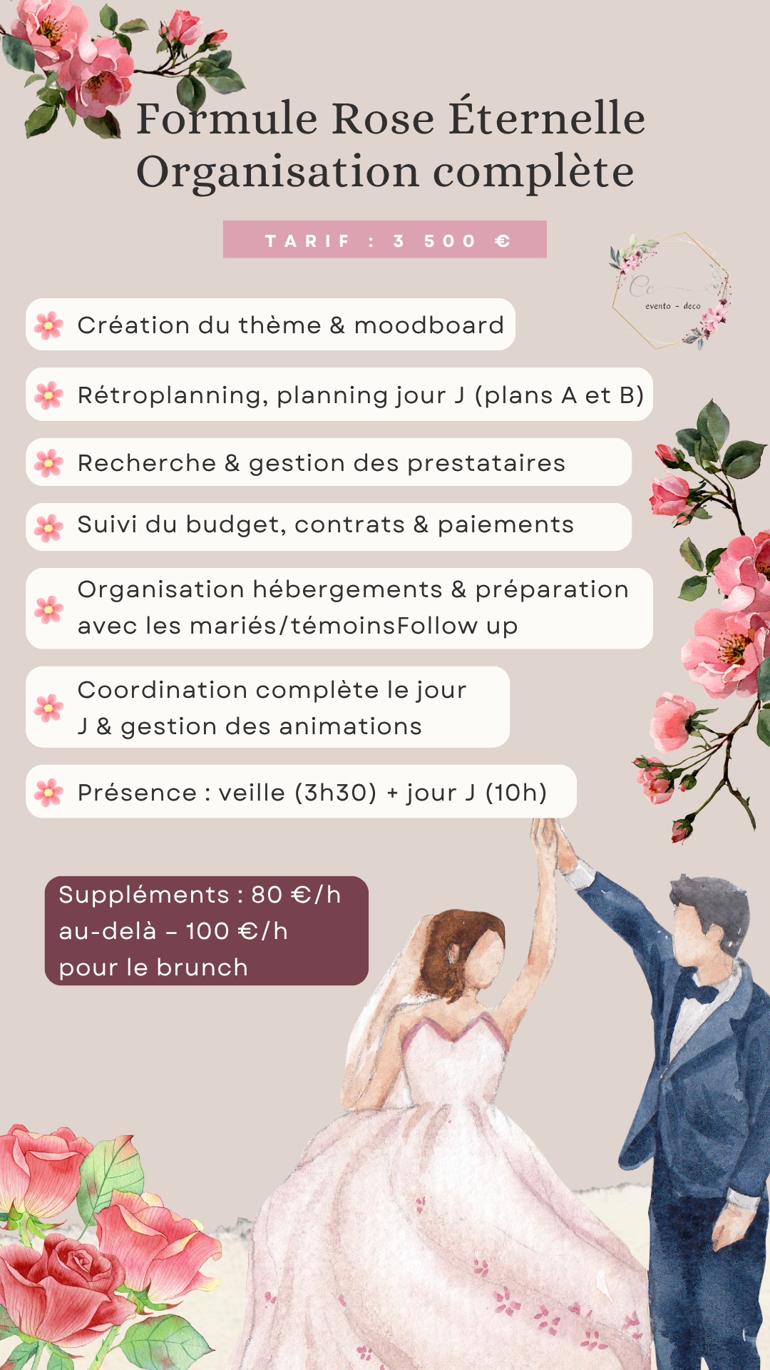🔑 Une formule idéale pour les couples qui souhaitent profiter d’un mariage sans stress, avec la garantie que tout se déroule à la perfection.